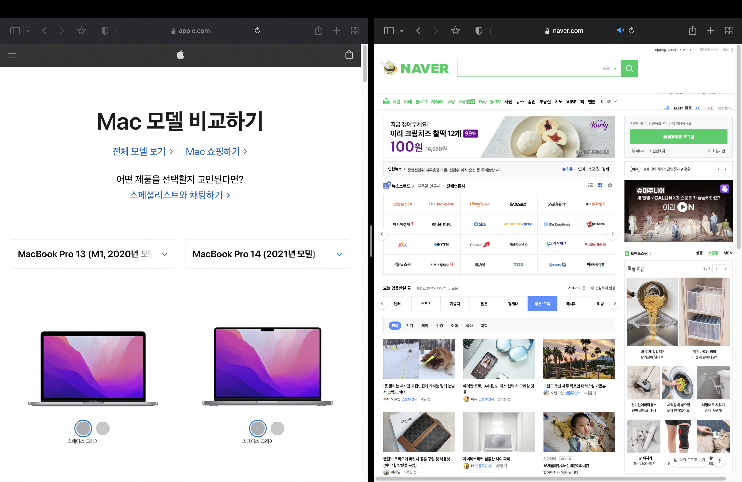 그러면 다음과 같이 윈도우에서 사용했었던 화면 분할이 맥북에서도 가능해진다.