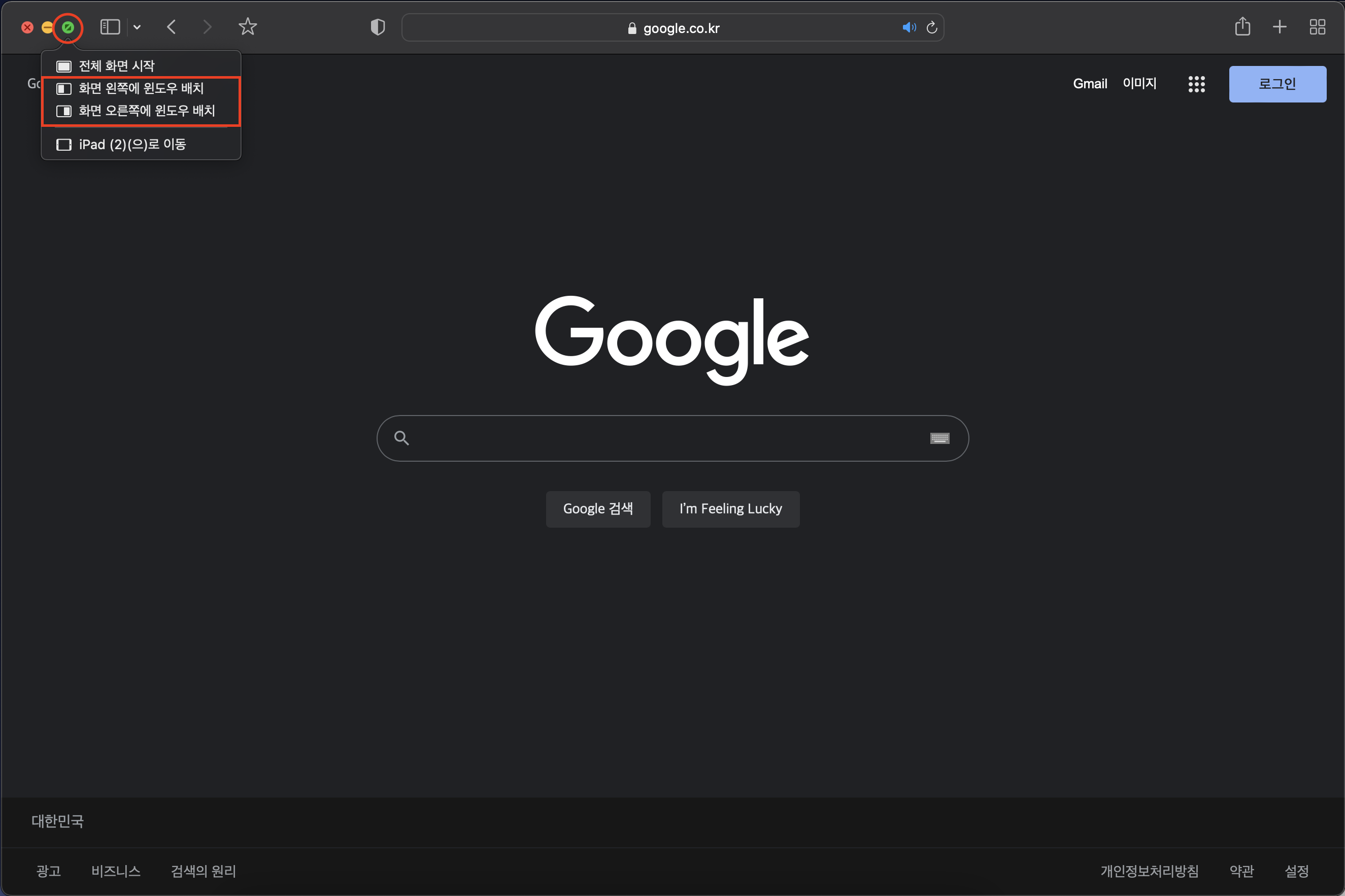상단바의 초록색 버튼 위에 포인터를 올려놓거나 길게 누르게 되면